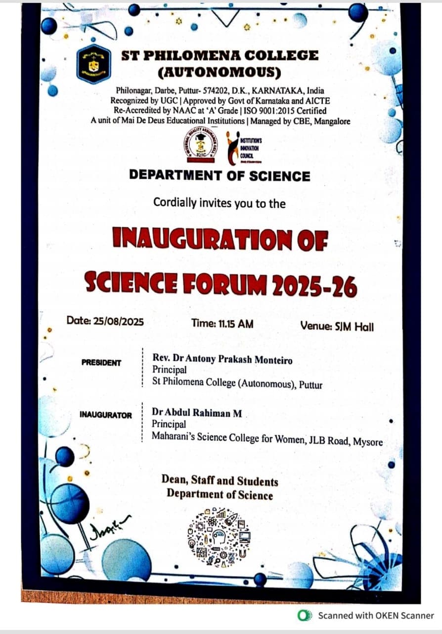 In a move aimed at nurturing young scientific minds, St Philomena College (Autonomous) officially inaugurated its Science Forum for the 2025-26 academic year on Monday. The new forum is set to serve as a vital platform for students to engage in critical thinking and innovative research, with a strong focus on the practical application of scientific knowledge.