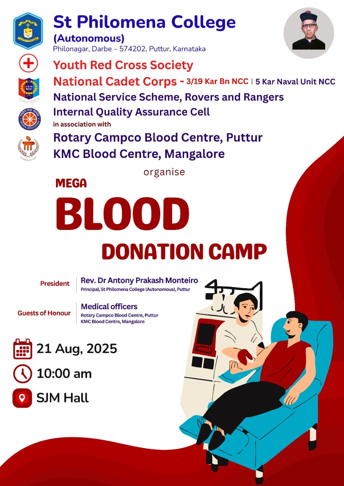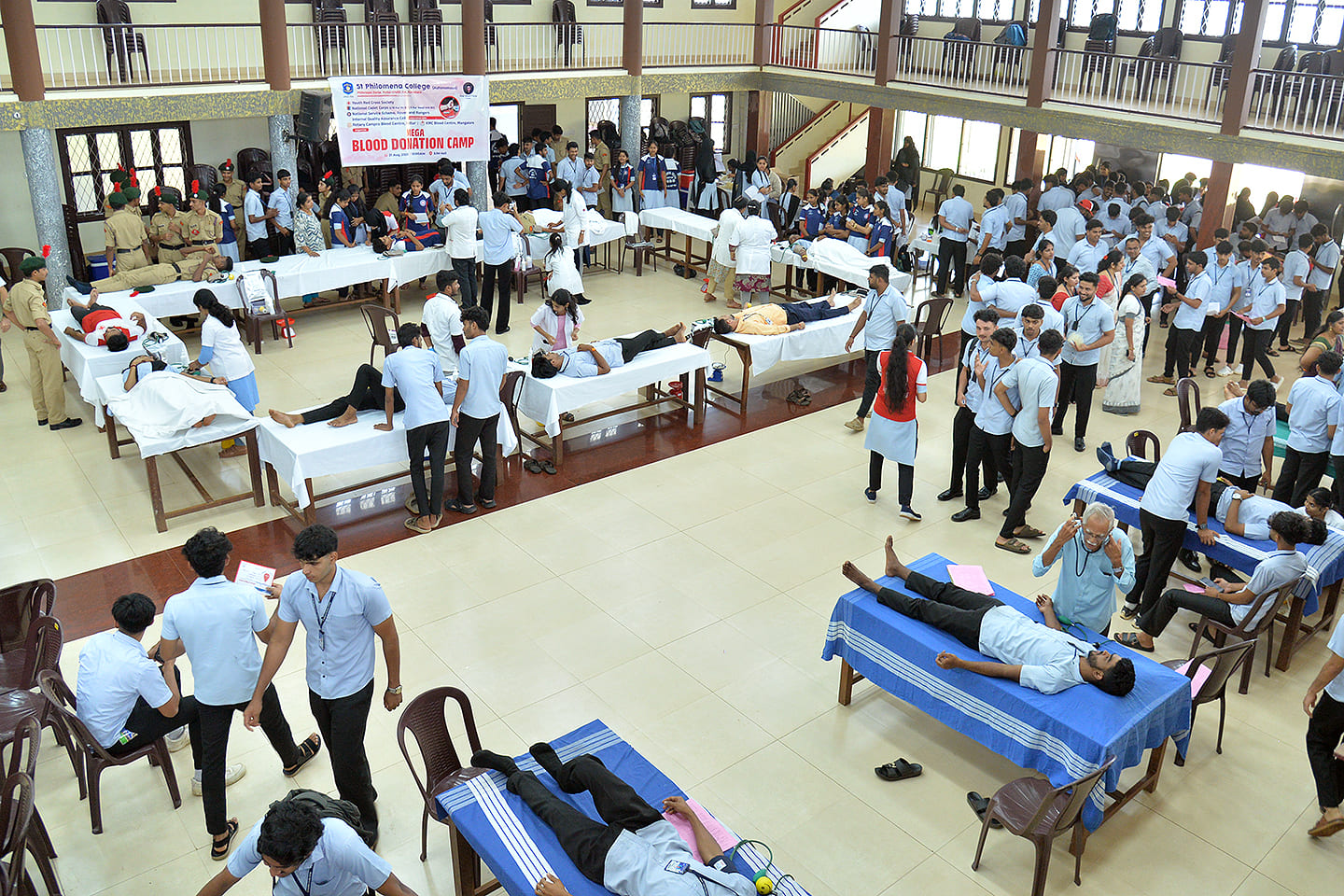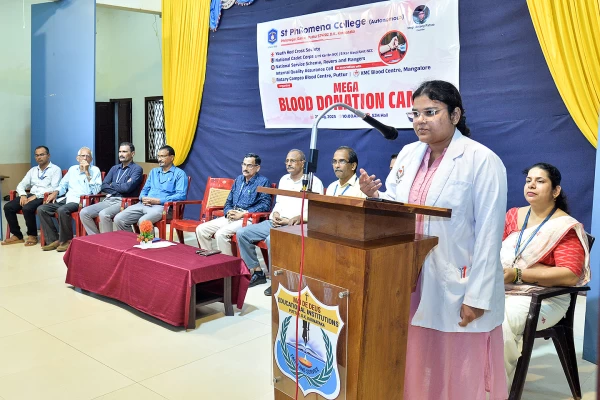 The Youth Red Cross Society, NCC Army and Navy, NSS, Rovers and Rangers, IQAC and Health Center of St Philomena College (Autonomous)in association with Rotary Campco Blood Center, Puttur and KMC Hospital Mangalore, organized a Blood Donation Camp on August 21, 2025 at SJM Hall of the college.