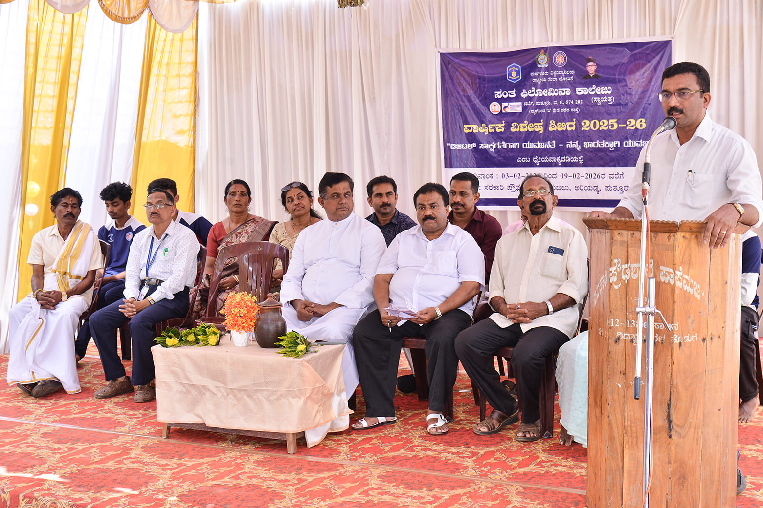 The valedictory ceremony was graced by Very Rev. Lawrence Mascarenhas, Correspondent of St Philomena College (Autonomous), Puttur, Dr K. Sheshappa, NSS Programme Coordinator, Mangalore University; Dr Vijaya Kumar Molayaar, Vice-Principal of St Philomena College (Autonomous), Puttur, Mrs Meenakshi Papemajalu, Mr Sridhara Poojary, Mr Sachin Papemajalu, Mrs Mallika J. Rai, Dr Haji S. Aboobacker Arlapadavu, Mrs Shashikala and Ms Praveena, among others.