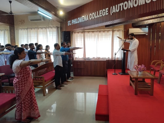 In commemoration of Constitution Day on November 26, St Philomena College conducted a solemn oath-taking ceremony at the college auditorium. Principal Rev. Dr Antony Prakash Monteiro read the Preamble and administered the oath, with active participation from students, faculty, and staff. Emphasizing constitutional values such as equality, justice, liberty, fraternity, and democratic principles, Dr. Monteiro highlighted the historic adoption of the Indian Constitution on November 26, 1949, and its enforcement on January 26, 1950. He also raised awareness of Dr B.R. Ambedkar’s significant contributions to the drafting committee. Following the program, the college community joined a Constitution Awareness March jointly organized with local government bodies. The march began at Darbe Cross and culminated at Kille Maidan, reinforcing the importance of constitutional literacy and civic responsibility.
