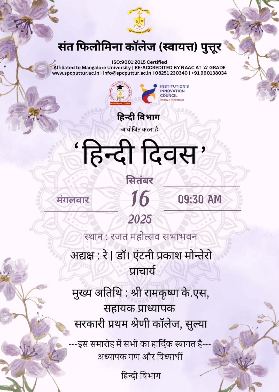 St Philomena Autonomous College, Puttur, celebrated Hindi Diwas in the college auditorium on Tuesday. The event highlighted the significance of Hindi as a unifying language and its growing relevance in global communication.