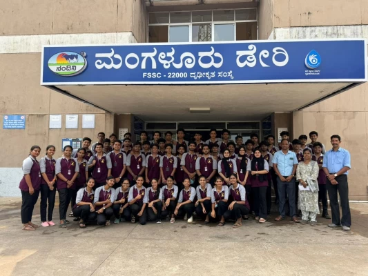 The I BBA and BBA Analytics students visited Nandini Dairy at Kulashekara. The officials briefed them about milk procurement from cooperative societies, processing methods, quality control measures, packaging techniques, and distribution networks.