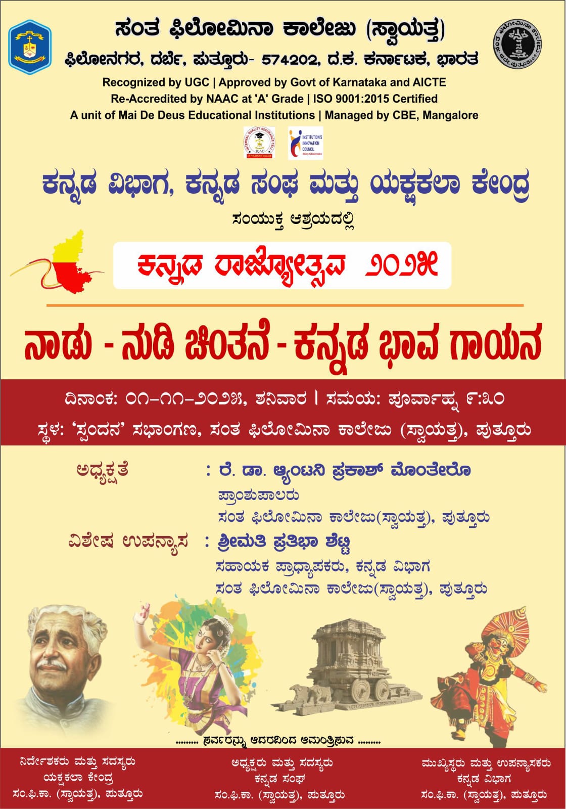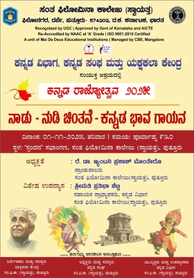 St. Philomena Autonomous College, Puttur, in a joint initiative with the Kannada Department, Kannada Sangha, and Yaksha Kala Kendra, celebrated Kannada Rajyotsava on November 1 with a special cultural and literary program held at the Spandana auditorium of the college.