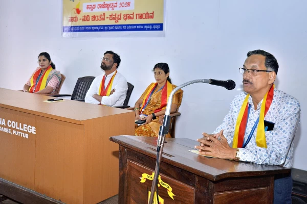 The event commenced with an illuminating lamp ceremony. Assistant Professor of Kannada, Pratibha Shetty, delivered a special lecture emphasizing the significance of Kannada as more than a language but as the very essence of the identity and emotions of the Kannada people. She highlighted the indelible struggles of Kannada warriors such as Huilagola Narayan Rao and Alur Venkataraya, who fought bravely for the preservation of the Kannada language. She lamented the current threat posed by dominant foreign languages and urged the Kannada community to revive their spirit and work towards the survival and flourishing of Kannada. She stressed that love for the language must transcend this single day and be expressed with pride every day.