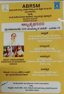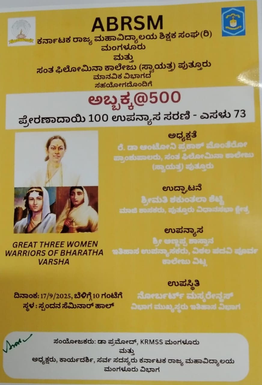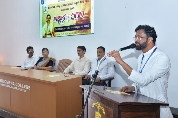 Department of Humanities, St Philomena College (Autonomous), Puttur in association with Karnataka Rajya Mahavidyalaya Shikshak Sangha (KRMSS) affiliated with ABRSM organised “Abbakka @ 500”- Series of 100 Inspirational Lectures at Spandana Seminar Hall.