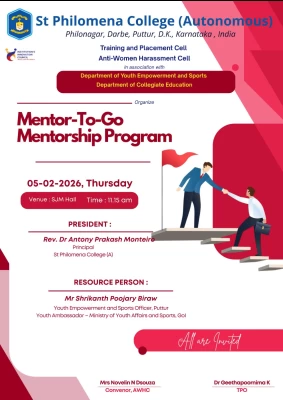 In a significant move to bridge the gap between academic learning and career readiness, the Training and Placement Cell and the Anti-Women Harassment Cell of St Philomena College (Autonomous), Puttur, hosted the “Mentor to Go” mentorship program on Thursday. The event, held at the SJM Hall, was organized in collaboration with the Department of Youth Empowerment and Sports and the Department of Collegiate Education. The initiative aimed to equip students with the essential tools for personal growth, leadership, and professional excellence.