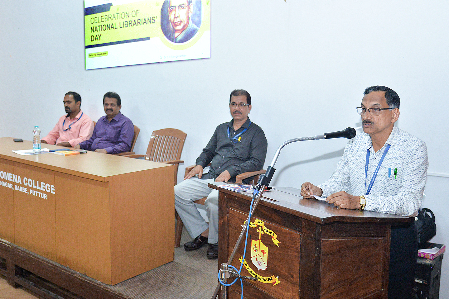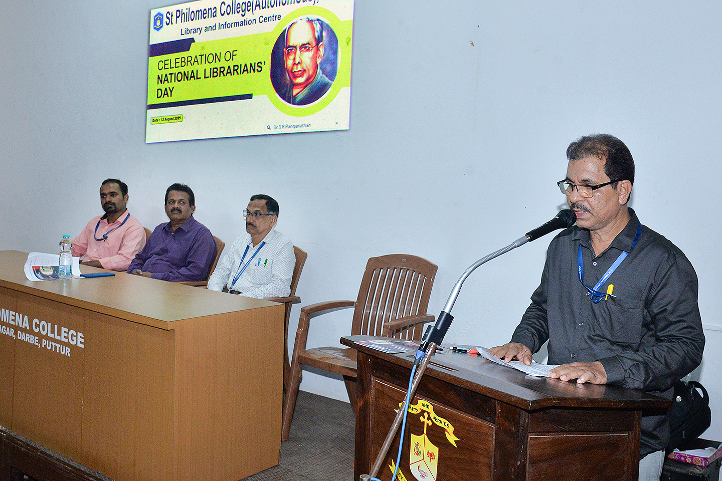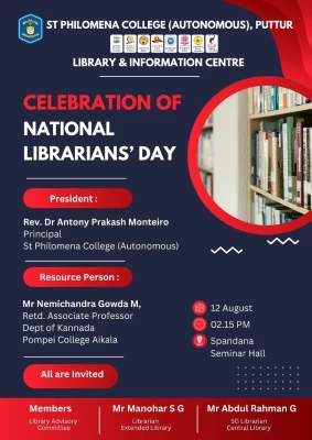 The Library and Information Centre of St Philomena College (Autonomous), Puttur, celebrated National Librarians’ Day on August 12, 2025, at the Spandana Seminar Hall to commemorate the 133rd birth anniversary of Dr. S.R. Ranganathan, the father of the Library Science Movement in India. Prof. Nemichandra Gowda, Retired Associate Professor of Kannada, Pompei College, Aikala, was the Resource Person for the event. The function was presided over by Dr. Vijayakumar Moleyar, Vice Principal of the College.