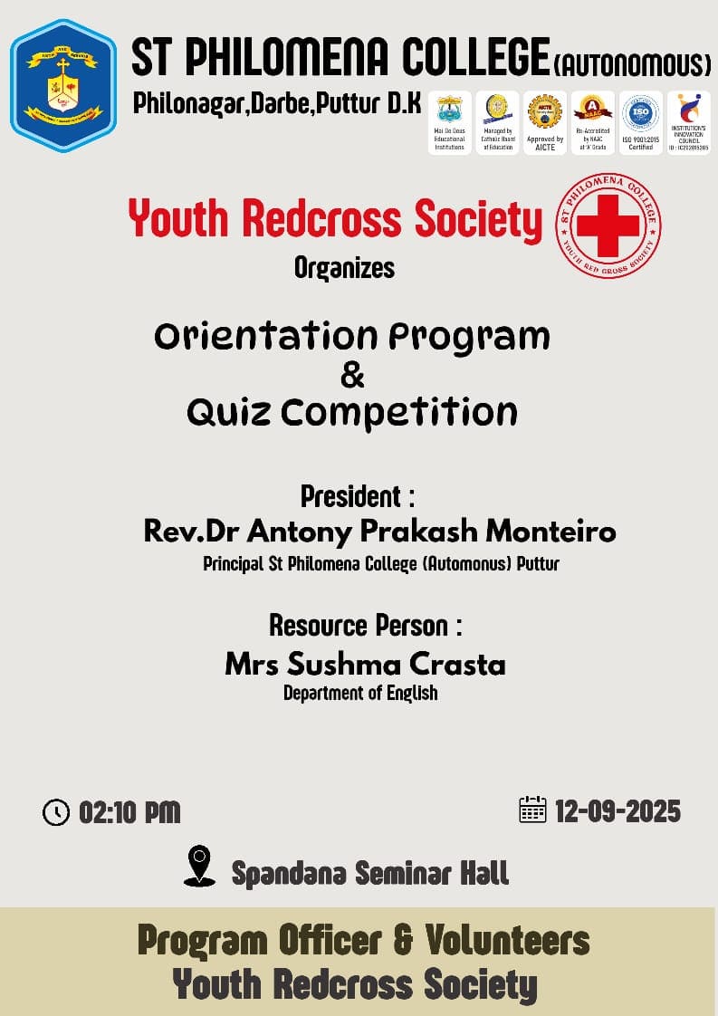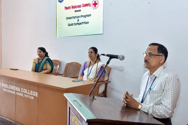 Youth Red Cross , St Philomena College(Autonomous) Puttur organized an orientation program and quiz competition for the youth red cross volunteers. The Vice Principal Dr Vijay Kumar Moleyar in his presidential remarks pointed out that students should not only focus on academic excellence but also dedicate time to help those in need, whether through local charities, community events, or environmental initiatives and share expertise and guide others in achieving their goals.He further said that students should use their voice to raise awareness about important issues, challenge injustices, and promote equality.