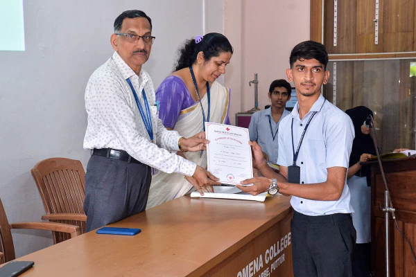 The orientation gained even more depth with the resource person Mrs Sushma Crasta, Assistant Professor in the Department of English .Her knowledge enriched the understanding of Youth Red Cross .She also shed light on the origin, objectives and activities of Youth Red Cross. Ashfiya read out the list of interns and were rewarded. A quiz competittion was conducted by Rumaiz and Jowher .Youth Red Cross Convener Dr Dimple Jennifer Fernandes was present on stage.The program commenced with a prayer performed by Avani and team . Muqshith extended a warm welcome. Roshan thanked. Muzamil compered.
