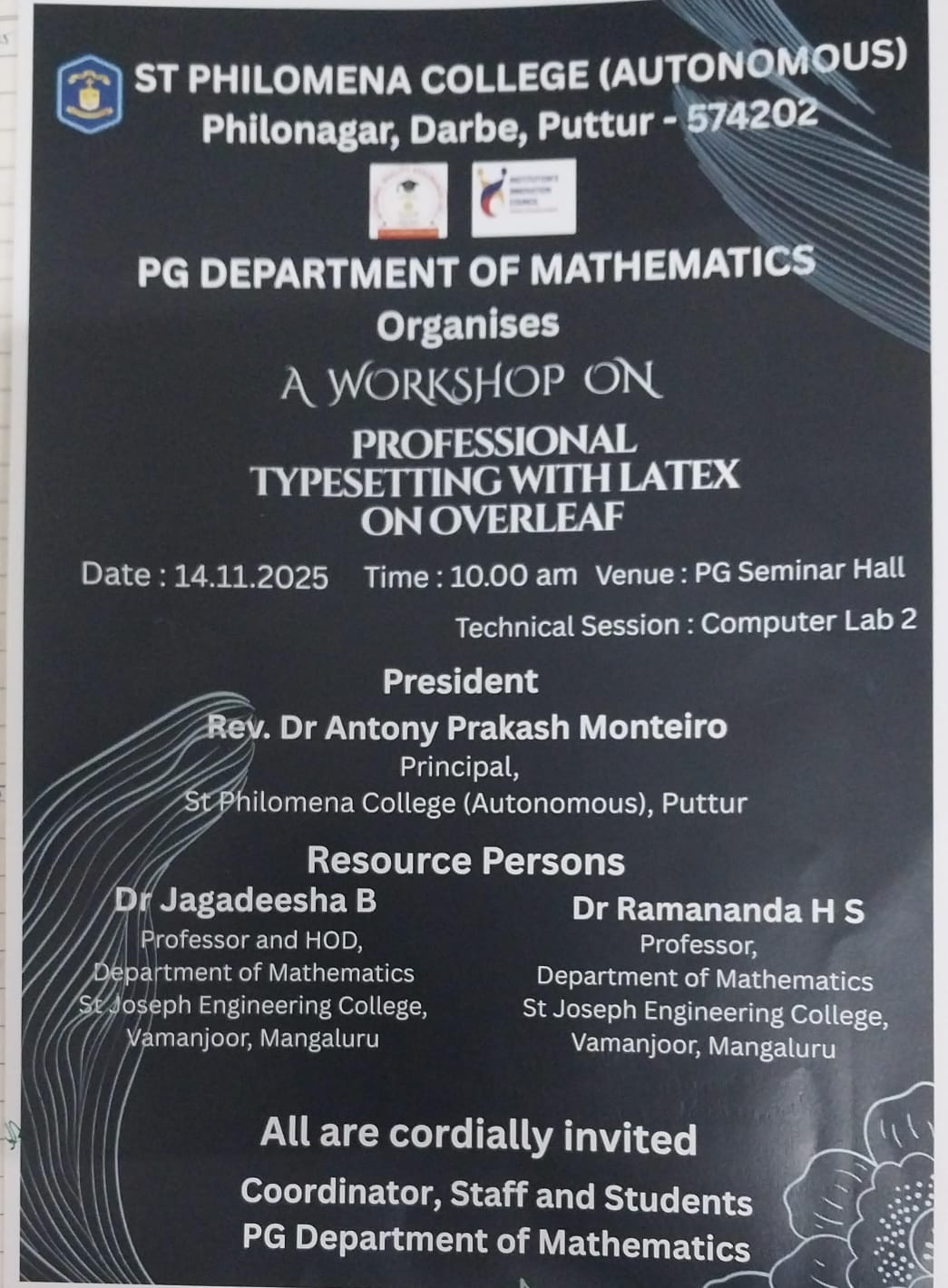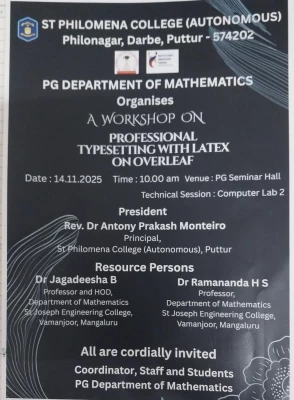 The Postgraduate Department of Mathematics at St Philomena College (Autonomous), Puttur, hosted a one-day workshop titled “Professional Typesetting with LaTeX on Overleaf” on November 14, 2025. Designed to familiarize postgraduate students with advanced documentation skills, the event provided focused training on the effective use of LaTeX, a powerful tool for academic writing and research documentation.