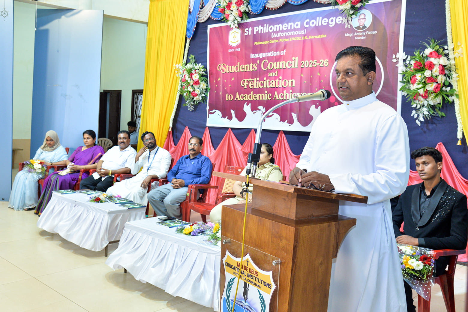 Chief guest and college alumnus Dr Narendra Rai Derla, retired Professor of Kannada inaugurated the event with a ceremonial lighting of the lamp. Addressing the gathering, Dr Derla highlighted St Philomena College as a beacon of form and intellect, praising the institution for its manifold pathways to success: whether it’s through initiatives supporting underprivileged students, the international achievements of athletes, the legacy of handwritten magazines like Antaranga Philovani, or the dedicated services of its faculty. He stressed that those elected to the Student Council bear a significant responsibility to uphold the prestige and values of the college, wishing continued brilliance for the institution.