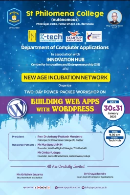 A two-day workshop titled “Building Web Apps with WordPress” was jointly organised by the Department of Postgraduate Studies in Computer Applications, St Philomena College (Autonomous) Puttur, the New Age Incubation Centre, and the WordPress Community, Udupi.