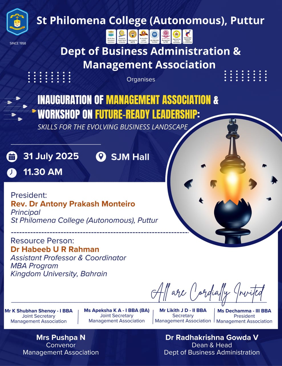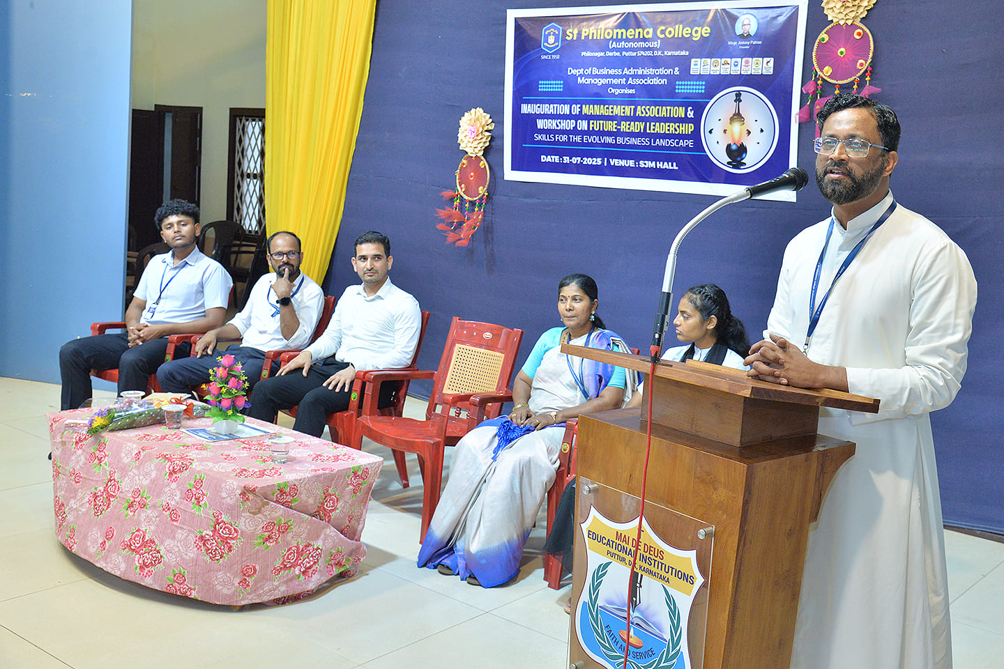 The Department of Business Administration, St Philomena College (Autonomous), Puttur, marked a significant milestone with the formal inauguration of the Management Association and the conduct of a one-day workshop on the theme “Future-Ready Leadership” at the SJM Hall on Thursday.