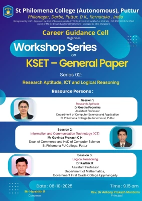 The Department of Postgraduate Studies at St Philomena College (Autonomous), Puttur, in association with the Career Guidance Cell, organized a three-day KSET-NET General Paper Workshop Series exclusively for postgraduate students to enhance their preparedness for competitive academic examinations.