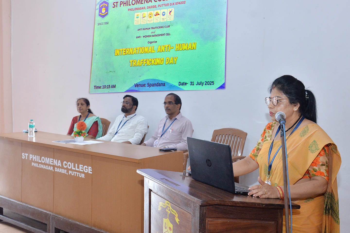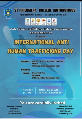The Anti-Human Trafficking Club and Anti-Women Harassment Cell of St Philomena College (Autonomous), Puttur, observed ‘World Day Against Trafficking in Persons’ with an awareness programme aimed at sensitizing students about the rising threats of human trafficking and gender-based violence.