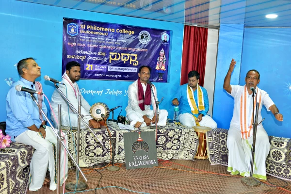 As part of the golden jubilee celebrations of the Kannada Association, St Philomena College (Autonomous), Puttur, hosted a grand Yakshagana Tala-Maddale performance titled “Sudhanva” on Wednesday at the Postgraduate Seminar Hall and was organized under the auspices of the YakshaKalakendra of the College.